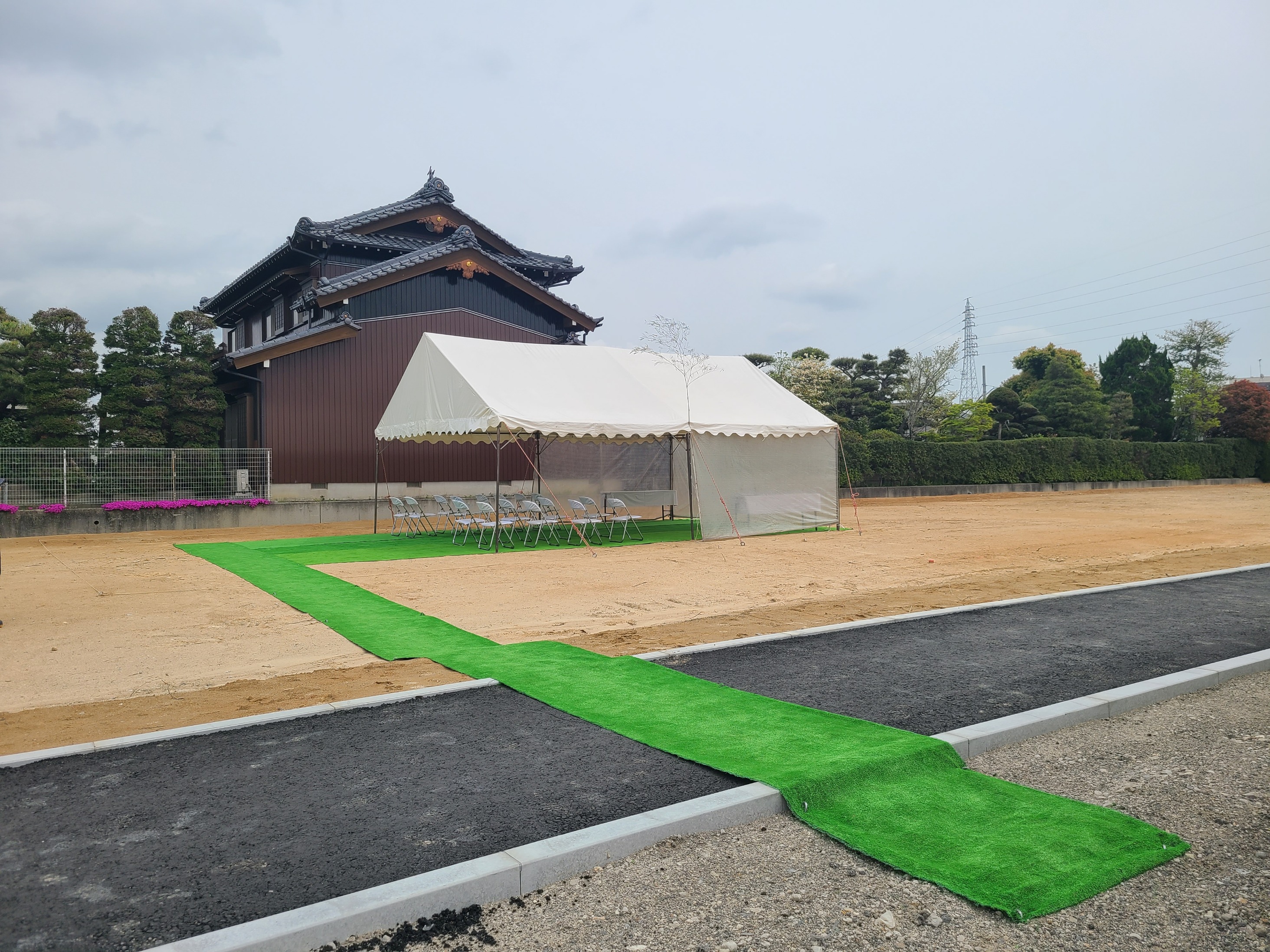 テント内はもちろん、駐車場からテントまでの通路も人工芝を敷いたり、